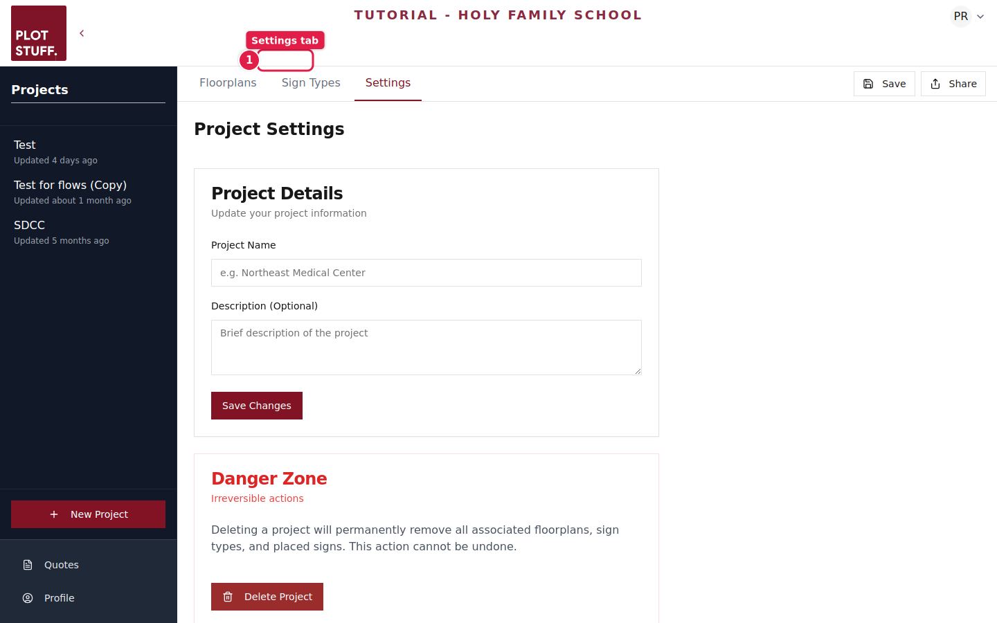 At the bottom of the Settings page, you'll find the Danger Zone section. This contains irreversible actions like deleting the project. Deleting a project permanently removes all floorplans, asset types, and placed assets — so use this with caution.